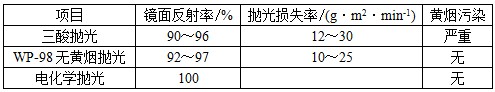 WP-98添加剂克服了以往无黄烟抛光工艺存在的抛光时间过短、抛光亮度不高的缺陷,同时在使用WP-98添加剂进行抛光时工艺要求宽松,其抛光工艺非常适合工业生产的实际需要,完全能够替代传统的三酸化学抛光。此外,环保监测证明,该工艺不存在氮氧化物黄烟污染问题。