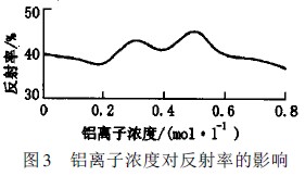 抛光液中的铝离子对抛光有双重影响:(1)抑制铝的腐蚀,提高反射率可以同时抑制铝的均匀和不均匀腐蚀,通常随着铝离子浓度的增加会提高抛光反射率,并且有利于减少麻点;(2)高浓度时降低反应速度,抛光反射率下降浓度过高时增加了抛光液的粘度,但同时也降低了反应速度,不利于整平。因此,铝离子浓度过高时抛光亮度有所下降,见图3。