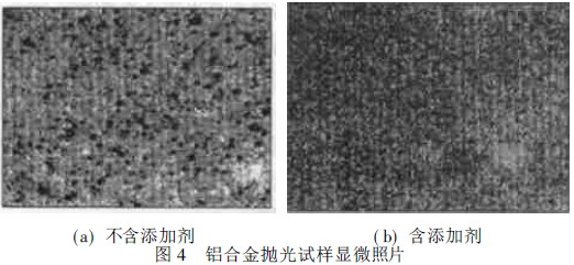 图4a、4b分别是不含添加剂、含添加剂时铝合金抛光试样的显微照片,实验条件为:温度100℃,时间60s,H3PO4:H2SO4=2:1。从照片上很容易看出二者的区别:在图4a上有大量的“麻点”存在,这是由于发生了点腐蚀而产生的蚀坑。加入添加剂WP-98后,可以看到抛光化学反应由剧烈的、类似沸腾状态变为平缓反应,释放的大体积气泡也变得细小致密。这表明添加剂WP-98的加入降低了表面张力,改善了溶液在铝表面的润湿性。在整平、增亮作用下,有效抑制了点腐蚀,并使金属溶解反应集中在金属表面微观凸起处,从而获得平整光洁的表面。
