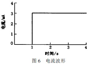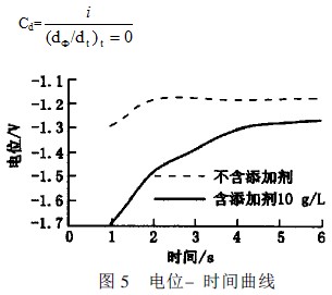 图5是由电流阶跃法测得的加入添加剂前后的电位-时间曲线,图6是电流波形。由图可看出,在未施加极化电流的时候两曲线的起始点均为其自腐蚀电位,加入添加剂后的体系自腐蚀电位由- 1.3 V负移至-1.7V,说明加入的添加剂属于阴极性缓蚀剂,一般来说阴极性缓蚀剂可以有效减少点蚀。当施加微小阶跃极化电流后,二者电位随时间变化的曲线斜率(dФ/dt)t=0不同,且(dФ/dt)t=0含>(dФ/dt)t=0不含。根据电极表面双电层微分电容公式为: