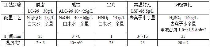 (3)材料处理步骤:脱脂→水洗→碱蚀→水洗→出光→水洗→抛光→水洗→阳极氧化→水洗→常温封孔。