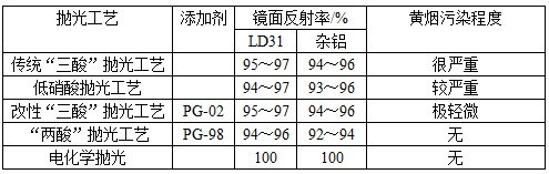 我们在20世纪90年代初开发出了PG-98型“两酸”化学抛光添加剂,在多年的实际应用中发现,在纯铝上效果最好,有电抛光的96%的反射率,与“三酸”抛光相近,但是对杂铝效果较差,只有“三酸”抛光的95%左右。只有高纯铝才有可能达到最好水平,杂质成分较高时难以达到理想的效果。我们据此又进行了大量的工作,对国外专利及文献进行大量检索,发现现在国外几乎没有突破性的“两酸”抛光工艺出现。