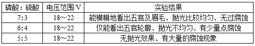 实验得出,磷酸和硫酸的体积比为7:3时抛光整平性、光亮度较好,基础液中存在一定比例的硫酸,能提高抛光液的导电性,降低槽电压,但硫酸过多会增加溶液的腐蚀性,对抛光不利。
