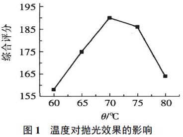 确定电解液基本组成以及电流密度后,固定条件对温度进行单因素实验。当温度低时,电解液黏度升高,离子扩散速度慢,铝合金表面附近的铝离子浓度容易达到饱和状态而形成黏膜状氢氧化铝,粘在铝合金表面从而使表面变成灰色,导致光亮度下降;当温度高时,电解液黏度急剧下降,但铝合金表面易产生腐蚀点,且溶液挥发增大,工作环境变差。因此,抛光工作温度以70℃适宜。温度对表面质量的影响如图1所示。