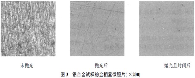 从图3金相显微照片中可以看出,未抛光的铝合金的表面粗糙不平,有大量明显的凹陷竖条纹和右斜条纹及斑点;而抛光后的铝合金表面平整光滑,但略带些黑斑点,尚能看见少量的凹陷条纹;抛光且封闭后的铝合金,纹理消失,除少量斑点外,表面细腻而平整。