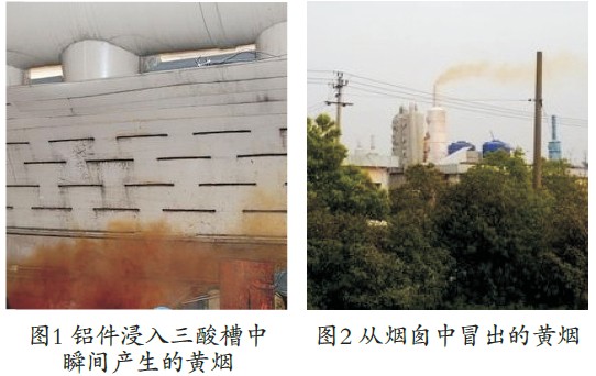纯铝或铝合金制件在磷酸—硫酸—硝酸化学抛光溶液中,表面组织的金属分别与三酸反应而生成磷酸铝、硫酸铝和硝酸铝。同时产生毒性很大的棕(红)黄色氮氧化物气体,俗称“黄龙”(即NOx),它是在铝件浸入抛光液时,瞬时爆炸式产生的,呈棕(红)黄色的滚滚浓烟逸出,见图1、图2。在众多废气治理中,NOx难度最大,是污染大气的元凶。如果得不到有效控制,不仅对操作人员的身体健康与厂区环境危害极大,而且随风飘散对周边居民生活与生态环境造成公害。