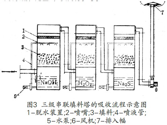 要降服“黄龙”很难,要“达标”更难。国内外报道过许多方法,归纳起来有干法、湿法和干湿法三种方法。由于各厂产品不同,选择适合生产实际的治理工艺方案和净化设备十分重要。笔者进行了现场调研,多数企业仍以湿法为主。根据工厂实践经验,湿法净化黄龙,认为采用“氢氧化钠、双氧水、硫化钠”的三级吸收塔的吸收效率最高,三级串联填料塔的吸收流程见图3,供同行参考。