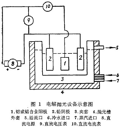 铝或铝合金制品在电解抛光前,必须经除油和出光处理,使其表面洁净而呈银白色,然后进行电解抛光。其设备如图1所示。在抛光过程中,发生了下列主要反应。