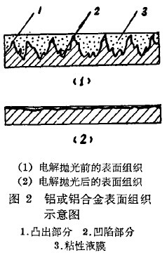 随着电解抛光的进行,在电解液中Al3+、cr3+离子及其磷酸盐等不断地增多,并和酸类混合成为粘度大、导电性低的浆状液体,附着于阳极的表面而形成一层粘性液膜。制品表面的金相组织凹凸不平,其凸出部分所沾附的粘性液膜较薄,则电阻较小、电流密度较大,因而金属铝的溶解速度较大;其凹陷部分所沾附的液膜较厚,则电阻较大,电流密度较小,因而金属铝的溶解速度较小。由于凹、凸部分的金属铝的溶解速度不同,所以能使制品表面得到整平、抛光(见图2)。由此可见,上述粘性液膜对于铝或铝合金制品的电解抛光具有很重要的作用。