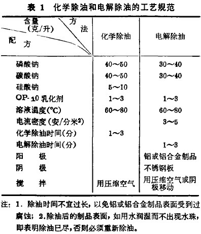(1)除油处理 电解抛光前的铝或铝合金制品必须先用汽油、甲苯等有机溶剂除去其表面所沾的大部分矿物油和动物脂等油污,然后按表1所列的除油工艺规范,进行化学除油和电解除油,直到除尽油污,最后用流动热水和冷水清洗干净。除油处理是借着溶剂溶解、皂化和乳化等作用来完成的。