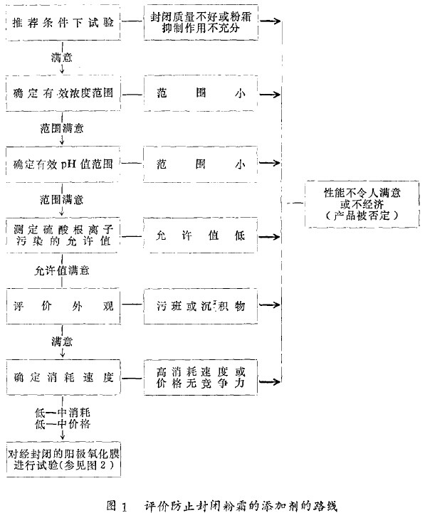 除了评价试验板条的外观与封闭质量外,还要考察溶液有无沉淀的迹象,后者可能在所选择的pH值范围的高端出现。这样的沉淀物能够沉积在封闭工件上,必须擦去,这就取消了应用抗粉霜添加剂的优点。