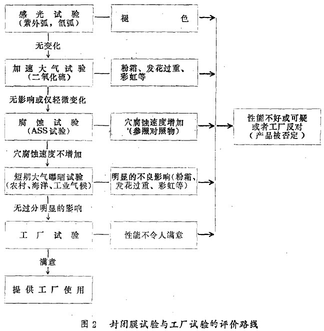 (3)对经含添加剂的封闭液封闭的试样进行选择性加速试验,以确定它对紫外线、SO2有否反应,或者对阳极氧化膜的耐蚀性有否影响。同时,为大气曝晒试验制备试样。若前述几个阶段的结果令人满意,则评价的最后阶段是工厂试验。