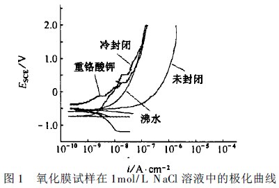 图1比较了几种封闭方法对氧化膜试样在1mol/L氯化钠溶液中的极化曲线的影响。从图1可以看出,氧化处理后,在测试电位范围内,氧化膜试样皆显示出了稳定的钝态。对于未封闭试样,由于多孔层的孔洞呈现“开放”状态,电解液很容易通过它而到达氧化膜阻挡层的表面,此时膜的耐蚀性主要体现在氧化膜阻挡层。而封闭处理后,氧化膜试样的钝化电流明显降低,说明封闭后氧化膜试样的耐蚀性有较大的提高,但不同封闭方法之间并无明显差异。