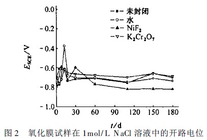 图2比较了几种封闭方法对氧化膜试样在1mol/L氯化钠溶液中的开路电位的影响。从图2可以看出,未封闭处理的氧化膜试样,其开路电位在浸泡前期(20~30天)电位波动较大。这主要是由于未封闭氧化膜在溶液中存在自封闭过程,从而导致试样表面发生较大变化而引起电位的波动。而经过封闭处理后的氧化膜试样,其开路电位在浸泡前期(20~30天)电位波动比较剧烈,这种电位波动可能与样品表面阳极氧化膜的破坏与修复过程有关,对于防护效果好的氧化膜层,溶液较难穿透它到达金属表面,腐蚀反应难以达到稳态,即使有些微小的局部发生破坏,也可能自动修复,表现在电位上,就是随时间的剧烈波动。