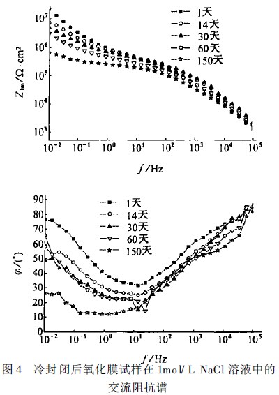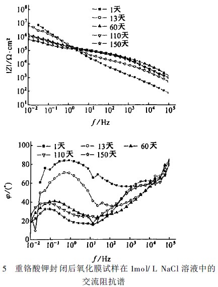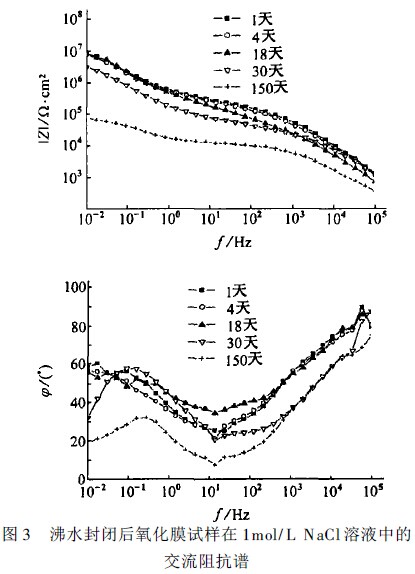 从图3可以明显看出,经过沸水封闭处理后,随着浸泡时间的延长,氧化膜的阻抗谱下移,即在一定频率下的阻抗随时间的延长逐渐减小,特别是浸泡150天之后低频段的阻抗下降很多,而中高频段变化幅度较小。从图4的阻抗谱图可以看出,冷封闭处理后氧化膜试样与沸水封闭处理之后的类似,在一定频率下的阻抗随时间的延长逐渐减小。从图5可以发现,重铬酸钾封闭处理之后的氧化膜,与沸水封闭和冷封闭后不同,随着浸泡时间的延长,中高频段的阻抗值变大。这与重铬酸钾的封闭机理有关,一般认为,沸水封闭和冷封闭主要是水合或水解沉淀物对氧化膜孔洞的机械封堵,而重铬酸钾封闭处理,是沉淀物的部分封堵与耐蚀钝化膜的共同作用。另外,三种封闭方法处理之后,其低频部分阻抗明显降低,说明经过较长时间浸泡后,溶液对氧化膜的阻挡层都造成了较为明显的影响。