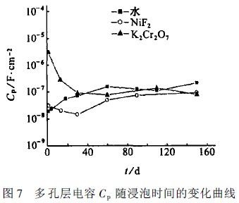 图6和图7分别为根据阻抗谱分析得到的多孔层电化学参数的变化曲线。从图6和图7可以更清楚地看到,重铬酸钾封闭处理的试样呈现与未封闭处理试样相似的自封闭过程,即多孔层的阻抗值随浸泡时间延长而较明显地增大(多孔层电阻Rp增大,多孔层电容Cp下降)。而冷封闭和沸水封闭后试样多孔层的阻抗值随浸泡时间延长而下降,沸水封闭后试样的多孔层阻抗值下降较快,这说明冷封闭处理后试样具有较高的耐蚀性。从氧化膜多孔层阻抗值的变化可以看出,在氯化钠溶液中经过较长时间浸泡后,不同封闭方法处理后的氧化膜试样的耐蚀性从弱到强的顺序是:沸水封闭<重铬酸钾封闭