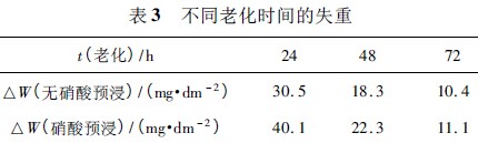 封孔液pH值5.5~6.5,温度52~60℃,封闭16min后不同老化时间测得的失重见表3。