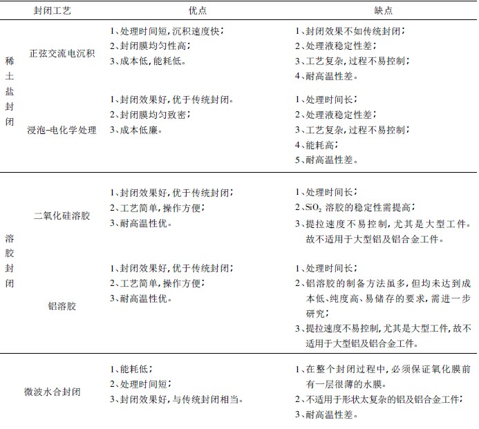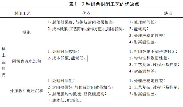 稀土盐封闭采用化学或电化学方法将稀土元素引入到氧化膜微孔内,主要通过稀土金属离子与溶液中的OH-发生反应生成稀土的氢氧化物沉淀来填充和覆盖微孔的,并在氧化膜上形成一层含稀土的转化膜;溶胶法主要利用物理吸附作用,将适当尺寸的溶胶胶粒渗入并覆盖氧化膜的微孔,并在氧化膜上形成一层溶胶层;微波水合封闭保留传统高温水溶液封闭的封闭机理,克服了高温水溶液封闭的缺点,改变了加热形式和水分子与氧化膜的接触方式。这3种绿色封闭工艺的优缺点如表1所示。