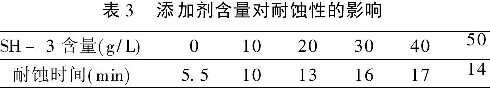 由表3可知,当电解液中不含添加剂时,阳极氧化膜的点滴时间仅为5.5 min。当添加剂含量为30g/L时,点滴时间上升到16 min,耐蚀性明显提高,而且染色后深黑光亮,说明添加剂SH-3有利于膜的增长和化学稳定性增强,使耐蚀性提高。但当添加剂含量超过40 g/L后,氧化膜耐蚀性有下降现象。这可能是添加剂的过量加入,降低了膜表层新生态[O]的浓度,影响了氧化膜的生长速度,从而使耐蚀性降低。