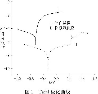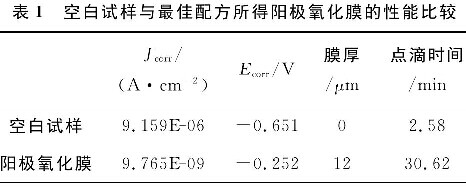 图1为空白试样与最佳配方所得阳极氧化膜的Tafel极化曲线。表1为空白试样与最佳配方所得阳极氧化膜的性能比较。由表1可知:与空白试样相比,最佳配方所得阳极氧化膜的自腐蚀电位正移了0. 399 V,自腐蚀电流密度降低了3个数量级,且点滴时间明显变长。