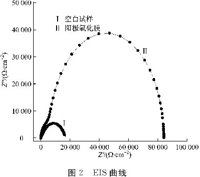 图2为空白试样与最佳配方所得阳极氧化膜的EIS曲线。用容抗弧半径的大小表征阳极氧化膜的耐蚀性,容抗弧半径越大,阳极氧化膜的耐蚀性越好。由图2可知:阳极氧化膜的容抗弧半径大于空白试样的,表明阳极氧化膜的膜层电阻较大,腐蚀介质很难与基体接触,表现出良好的耐蚀性。