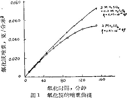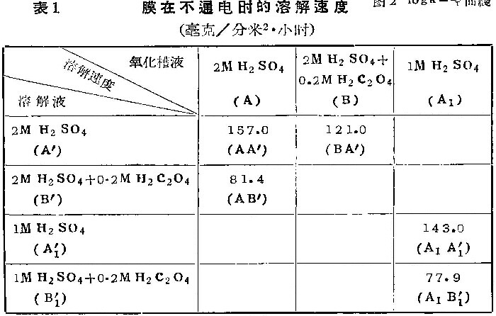 实验条件是:阳极氧化—20°C,1安/分米2,70分钟;溶解试验—20°C,1小时,结果列于表1。表中每一数值由6个平行试验数据平均。实验的重现性很好。
