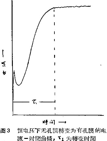 铝样品先在pH=5.5的3%酒石酸铵溶液中以10伏的恒电压进行阳极处理。此时在样品上生成厚度约为140A的无孔膜。将样品清洗后,再在添加和不添加草酸的硫酸溶液中以15伏的恒电压进行阳极处理,并以记录器记录电流-时间曲线。曲线的一艘形状如图3所示。随着无孔膜转变为有孔膜,电流逐渐增大,最后趋于平稳。从曲线上测定电流开始平稳的时间t1。这一时间就是从无孔层转变为有孔层所需要的时间。实验温度为20°C,结果列在表2。每一数值由10个平行试验结果平均。