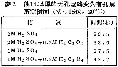2.硫酸浓度的改变对于有孔膜溶解速度的影响,比起草酸添加剂的效应,小到可以忽略。但在无孔膜与具有溶解性的电解液接触后转变为有孔膜的数十秒的过程中,虽然草酸添加剂有着明显的效应,但远不如硫酸浓度从2M降低为1M时所产生的效应大(表2)。因此,看来并不是氧化膜刚一浸入电解液中,草酸添加剂就立刻可以充分地产生降低膜溶解速度的效应。