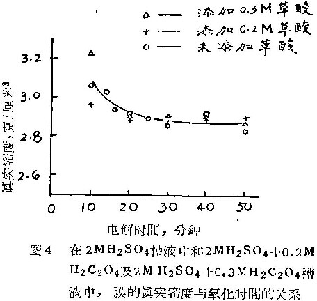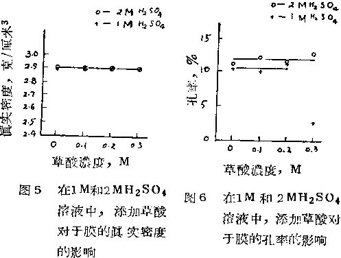 利用在我们的另一篇文章中描述的方法,研究了草酸添加剂对于膜的其实密度与孔率的影响。图4是在10°C,以1安/分米2在2MH2SO4槽液中和2MH2SO4+0.2MH2C2O4及2MH2SO4+0.3MH2C2O4槽液中氧化时,膜的真实密度与氧化时间的关系。而图5和图6则为分别在2MH2SO4和1MH2SO4溶液中添加不同浓度草酸对于膜真实密度和孔率的影响。相应于图5和图6的电解条件为10°C,1安/分米2,20分钟。