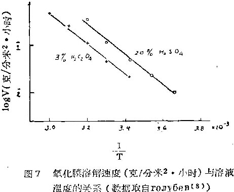 2.不仅我们的实验结果表明草酸对膜的溶解反应活化能没有显著的影响,RonyoeB的实验也可以作为旁证。RonyoeB以20%硫酸槽液中制得的膜置于20%硫酸溶液中,以3%草酸槽液中制得的膜置于3%草酸溶液中,在不同温度下测定了它们的溶解速度。我们拿他的数据在LogV-