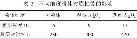表2表明粉体的细度对膜层性能有较大影响。粉体越细,则氧化膜越厚,耐蚀性越好,反之则膜层性能下降,有实验数据可知最佳粉体细度粒径为3µm。