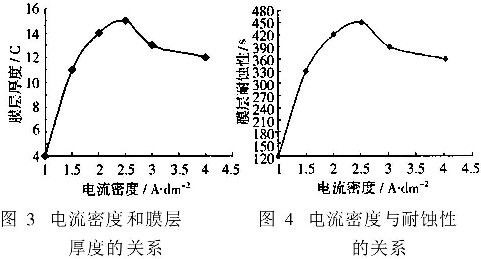 从图3和图4可以看出,电流密度的增加,氧化膜的厚度和耐蚀性先增加后降低,这是因为在一定范围内电流密度增大会降低铝阳极氧化膜的孔隙率,所以电流密度增大膜层耐蚀性增强,但是,当电流密度>1.5A/dm2后,则膜层孔内热效应加大,加速了膜的溶解,使膜层厚度变薄,耐蚀性下降,所以电流密度应控制在1.5~2.5A/dm2范围内。