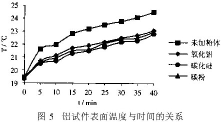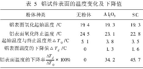 由图5,表5可知,难溶粉体的加入,降低了铝试件的表面温度,与未加粉体时比较,其表面温度下降值对本实验粉体而言,均> 1°C,下降率在20%左右。粉体不同,铝试片表面温度下降值也不同,下降值顺序依次为SiC、Al2O3。