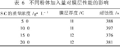 由表6可见,随着粉体浓度的提高,在一定范围内粉体在膜中的夹杂量增加就会使膜层硬度提高,而粉体的运动使膜层温度下降就会导致膜层厚度增加,与此同时膜层孔隙率下降,将带来耐蚀性的提高。当然粉体浓度不是越大越好,存在一个最佳范围,超过此范围,膜中粉体含量增多,膜层结合力下降,粉体浓度选用15 g/L