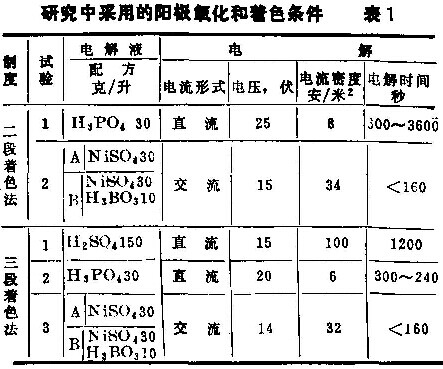 铝的阳极氧化为恒电压电解,电解方法是采用在磷酸溶液中的低电压电解为特征的多色化电解着色法。在获得1微米左右的较薄的氧化膜时,是采用表1中二段着色法的溶液组成和电解条件进行阳极氧化处理的。氧化膜较厚时,是采用表1中三段着色法的各种条件生成氧化膜,氧化膜生成时,电解溶液的温度为21±1°C。着色用的电解溶液分别示于表1,把每升含有30克硫酸镍的溶液作为基本溶液,把在基本溶液中添加10克/升硼酸的溶液作为着色用标准电解溶液。此时电解溶液的温度为室温。电解着色时,试料放在可以容纳2升电解溶液的烧杯中着色,并且每隔20秒钟取出一组试样。