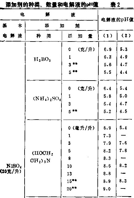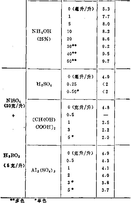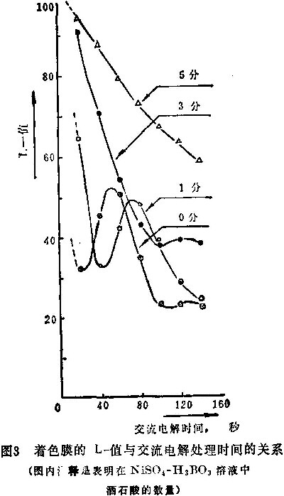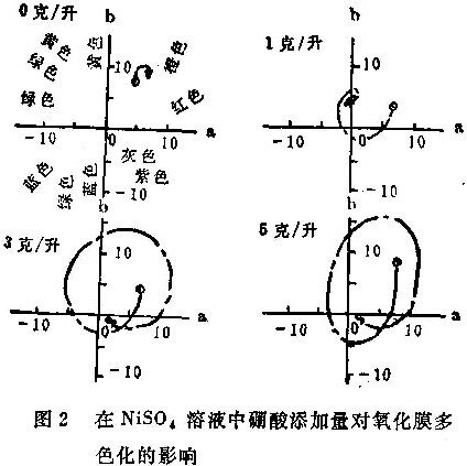 添加剂的效果,可以分为能促进氧化膜的多色化和单色化的两种,如表2。能促进多色化的,除前面谈到的硼酸之外,还有作为络合剂常被人们应用的铵化合物、胺类及氨水。为了完成氧化膜的多色化,其添加剂的加入量分别为:硫酸铵5克/升;三乙醇胺15克/升;25%的氨水30毫升/升。与其说氧化膜的多色化是受着色溶液pH值控制,不如说是受着色溶液中添加剂的量控制。例如表2中的硼酸,第一次试验完成多色化以后的pH值为5.6(添加量3克/升),但是在第二次试验中,不加硼酸时,着色溶液的pH值是5.3,此时氧化膜的多色化完全没有进行。再有,在硫酸镍中混合硼酸和胺,并且把pH值调整至6~8左右时,氧化膜的多色化显著地进行。这种氧化膜的多色化,用着色溶液的PH值来解释是不适宜的。一般的说法是在活性层上析出镍时,在其界面上存在pH值的问题。本研究中没有探讨界面的pH值,为了参考,仅示出着色溶液的pH值。