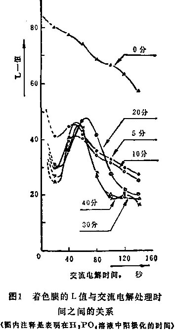 用普通方法所得到的硫酸氧化膜,为了获得浓褐色,通常是加入了硼酸等添加剂的金属盐电解溶液中,进行20分钟以上的着色处理。当生成硫酸氧化膜之后,在磷酸溶液中以5分钟左右的时间进行促进多色化处理的氧化膜,由于能有效地利用磷酸氧化膜着色性能好的优点,仅进行2分钟着色处理就能获得浓褐色。三段着色法虽然增加了电解工序,但是却可以缩短着色时间。图1是表示硫酸氧化膜生成后,随着在磷酸溶液中促进多色化电解的时间不同,氧化膜多色化的情况(以下把这个图的曲线叫做T-L曲线)。图1的横轴是表示三段着色电解时所需要的时间,纵轴是用L值表示的氧化膜的颜色特征。为了对比,在图中也示出了用通普方法获得的氧化膜,在着色用的标准电解溶液中着上褐色时的曲线(促进多色化电解的时间为0分)。从曲线可知,进行10分钟促进多色化电解处理的氧化膜,经过20分钟的着色处理后,便呈浓褐色。此后,再进行着色处理,随着时间的延长,氧化膜的颜色从红褐色→青灰色再变为褐色,这个变化呈独特的波状曲线。进行20分钟促进多色化的电解处理,氧化膜的多色化就进行到相当程度,但是,却得不到标准颜色变化顺序中红色以后的颜色,因此,此时的多色化还不充分。然而把促进多色化电解处理的时间进行到30分钟,氧化膜的多色化将继续发展,并可以得到在20分钟的情况下得不到的红色以后(从蓝色到绿色)的变化。当电解处理40分钟时,氧化膜的多色化便完成了,从上述的绿色之后继续变化,可以再次得到黄绿色或暗红褐色。