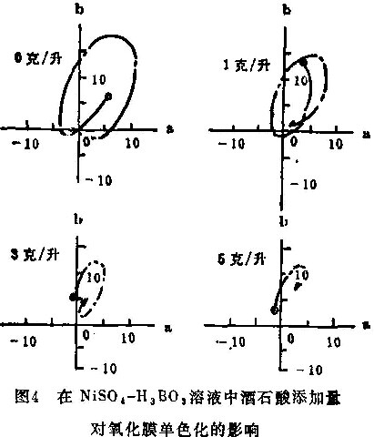 另外,能促进氧化膜单色化的添加剂是酒石酸、硫酸及硫酸铝。关于添加酸的效果,在