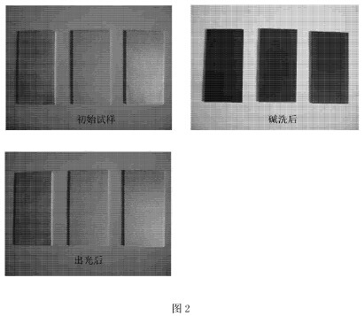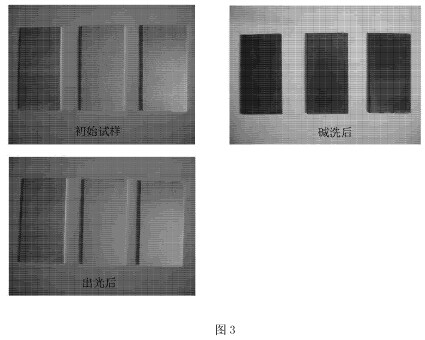 槽液的组成为:NaOH 75g/L-1,碱蚀剂80g/L-1,余量水;工作温度:30℃,工作时间2分钟。