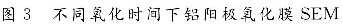 实验以混酸体系为电解液,电流密度为15mA·cm-2,反应时间分别为50 min、60 min、70 min,实验结束后通过扫描电镜观察反应时间对阳极氧化膜表面微观结构的影响,结果见图3。
