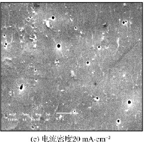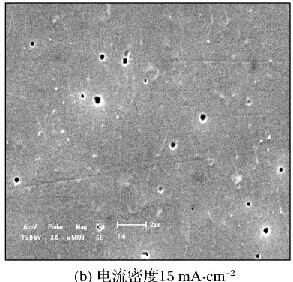 由图4可见,增大电流密度,阳极氧化膜表面微孔的分布情况发生变化,微孔的数量减少,微孔的形状也趋近于圆形;当电流密度超过15mA·cm-2后,继续增大电流密度,阳极氧化膜表面的微孔数量开始增多,部分微孔的形状又变得不规则。这是因为在一定电流密度范围内,随着电流密度的增大,氧化膜的生成速度也逐渐增大,并且生成速度增加的幅度随电流密度的增加而增大,而溶解速度的增加幅度小于生成速度的增加幅度,因此随着电流密度的增大阳极氧化膜表面的微孔数量逐渐减少,但是当电流密度增大到一定程度后,溶解速度会超过生成速度,同时氧化速度也会大大增加,因此生成的阳极氧化膜比较疏松,微孔数量也有所增加。