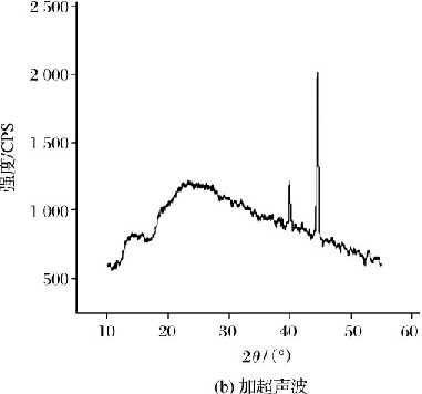 由图5可见,将超声波作用于阳极氧化过程中,阳极氧化膜的表面会生成白色的晶体,经过EDS分析发现,该白色晶体主要含Al、O元素。阳极氧化膜的XRD物相分析结果见图6。在图6(b)中,加超声波生成的阳极氧化膜的XRD图谱中出现了晶体峰,其角度为39.9°和44.4°,通过和标准谱图对照,发现这两个晶体峰是γ-Al2O3所对应的峰,说明在阳极氧化膜中含有Al2O3晶体,将XRD物相分析结果与扫描电镜分析相结合可知该白色晶体为Al2O3晶体。在图6(a)中,未加超声波生成的阳极氧化膜的XRD图谱中没有出现晶体峰,说明生成的阳极氧化膜是由非晶态的无水Al2O3组成。由此可见,在混酸体系中,未加超声波生成的阳极氧化膜是由非晶态的无水Al2O3组成,而将超声波作用于阳极氧化过程中,获得的阳极氧化膜的组成会发生改变,氧化膜中含有少量γ-Al2O3的晶态成分。
