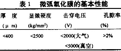 近年来,日本等国也陆续发表研究论文,他们以“铝上陶瓷层的形成”为题,这正好说明这项技术本质和机制尚需深入探索。微弧氧化可在过渡金属( Al、Nb、Ti和Ta等)上生成结合强度高,耐蚀和耐磨性好,耐热和介电性高的表面氧化物层。该技术的优点是不需特殊的表面预处理;形状复杂部件可以氧化;设备简单;环境条件较好。微弧氧化膜的性能见表1所示。表1数据表明,微弧氧化膜是非常理想的耐磨和高硬度表面,可望在纺织工业的高速旋转部件、汽车制造工业的活塞和气缸等处应用。
