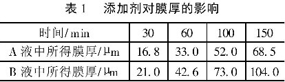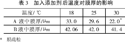为得到添加剂加入后温度对膜厚的影响,测定了不同温度下膜的厚度,结果如表3所示。工艺条件为:DA: 2A/ dm2;时间:60min。
