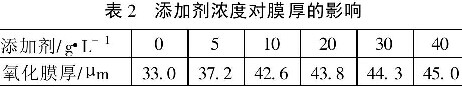 从表2可以看出,随着添加剂加入量的增加,膜的成长速度随之增加。当添加量为10/L时,氧化膜成长速度明显增加,继续增加添加剂的量,膜的成长速度变化不大。考虑综合因素,确定添加剂添加范围在10~30g/L。
