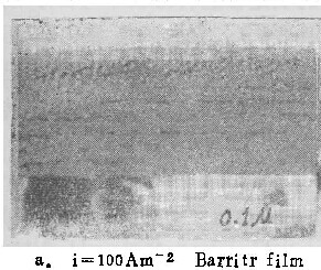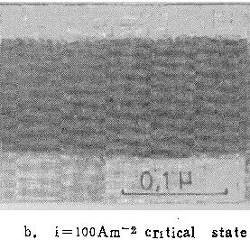 在温度为333K的0.25M铬酸中,膜的形态变化与以前几组照片类似。由表2可见,溶液温度升高后,在同样电流密度下,电流效率η下降,ic值则显著增加(由293K之100Am-2增至333K之约400Am-2)。