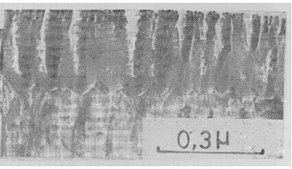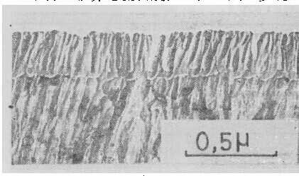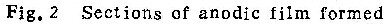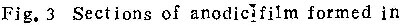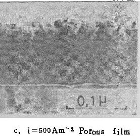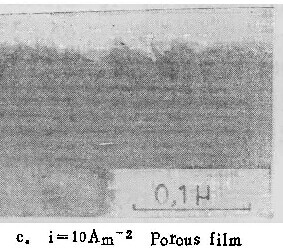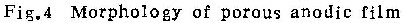 以上实验结果均表明,在所研究的溶液中,均有一个临界电流密度值。阳极氧化电流密度高于该值,形成壁垒型膜;低于该值则形成多孔型膜。图4中的照片即为在铬酸及磷酸铵溶液中低于临界电流密度值时,形成的多孔型膜的形态。