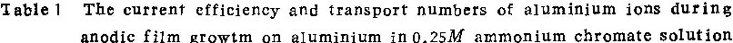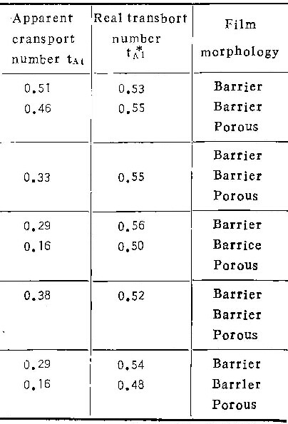 由上述模型可以看出,在多数,情况下,阳极氧化时向外迁移的铝离子总有一部份直接进入溶液而不参与膜的生长。故从标记原子层在膜中的位置测出的铝离子的迁移分数,并不表示在阳极氧化过程中铝离子所携带的电量与氧化过程总电量之比(即铝离子的真实迁移分数,在表1中用tA表示)。因此,我们把直接测得的迁移分数,称为“表观迁移分数”,用tA1表示。