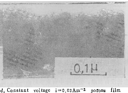 图3为pH=7.0的0.25M铬酸铵溶液中形成的膜的形态。由表1可见,此种情况下的电流效率很高。在i= 10~0.2Am-2范围内,均形成壁垒型膜。为确定在这种溶液中可否形成多孔型膜,我们首先在10Am-2电流密度下形成壁垒型膜(如图3a),最终阳极氧化电压为80伏,任电流衰减。经3小时后,电流稳定在0.03Am-2。这时膜的形态如图3a所示,已变为多孔型。这就说明:在中性铬酸盐溶液中,也可以形成壁垒型及多孔型两类膜,形态转变的临界电流密度ic在0.2Am-2以下(图3c),0.03Am-2以上(图3d)。