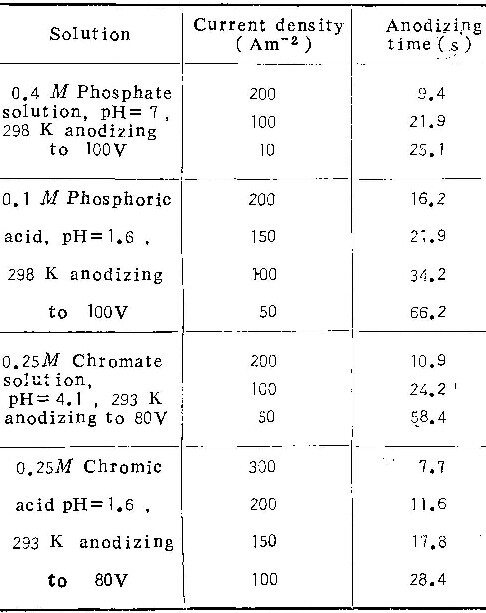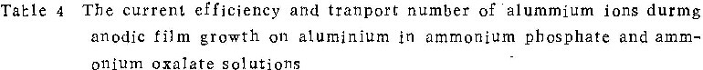 在0.1M铬酸、0.4M中性草酸铵及0.1M磷酸铵溶液中的实验结果列于表4。电镜观察类似于在铬酸盐溶液的情况,即随电流密度下降,阳极氧化膜的形态,也从壁垒型转变为多孔型,电流效率逐渐下降。由表4看出,在中性草酸铵溶液中,η值远远低于在中性磷酸铵或中性铬酸铵中者。且在草酸铵溶液中的ic值(≤100Am-2)也远远大于在中性铬酸铵(0.03Am-2~0.2Am-2)及中性磷酸铵(1 Am-2~10Am-2)中之值。至于磷酸铵溶液的酸度值对膜生长影响的规律,与在铬酸铵中一样。